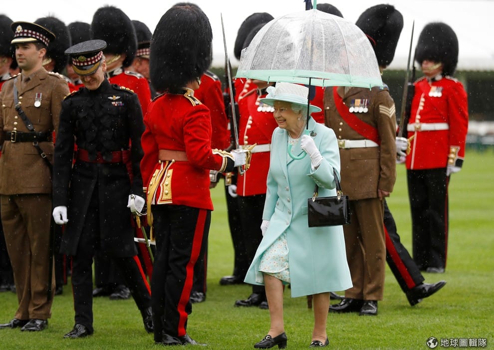 英國女王伊莉莎白二世撐著和大衣相映成趣的綠傘,檢視皇家衛隊的軍容。