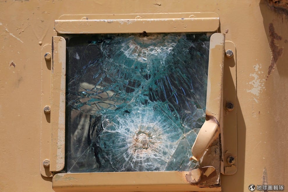 在伊拉克武裝部隊和恐怖組織伊斯蘭國(IS)對戰的摩蘇爾城(Mosul),一台軍車的車窗被攻擊而碎裂。