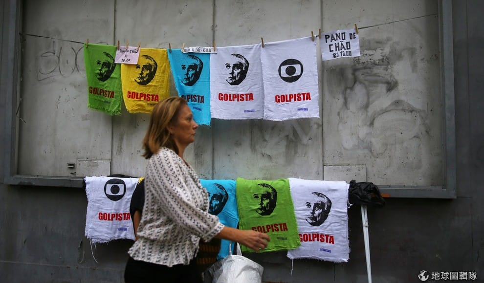 一名女子經過印有寫著「政變頭子」字樣和巴西總統特梅爾(Michel Temer)頭像的毛巾。