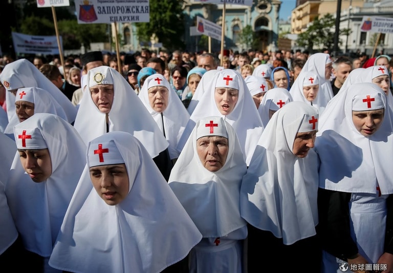 俄羅斯正教會轄下的烏克蘭正教會修女和信徒們在國會外抗議,他們不滿當局打算立法對烏克蘭正教會設下諸多限制,憤而上街捍衛宗教自由。