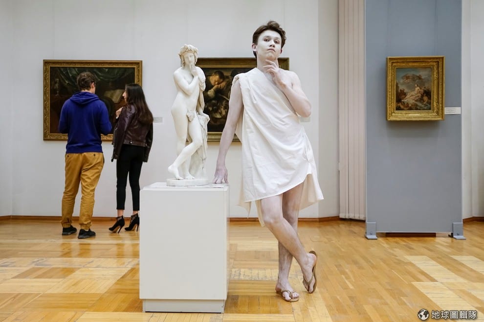 18號這天是國際博物館日,一名藝術家把全身塗白打扮成一尊大理石雕像和展品留影。