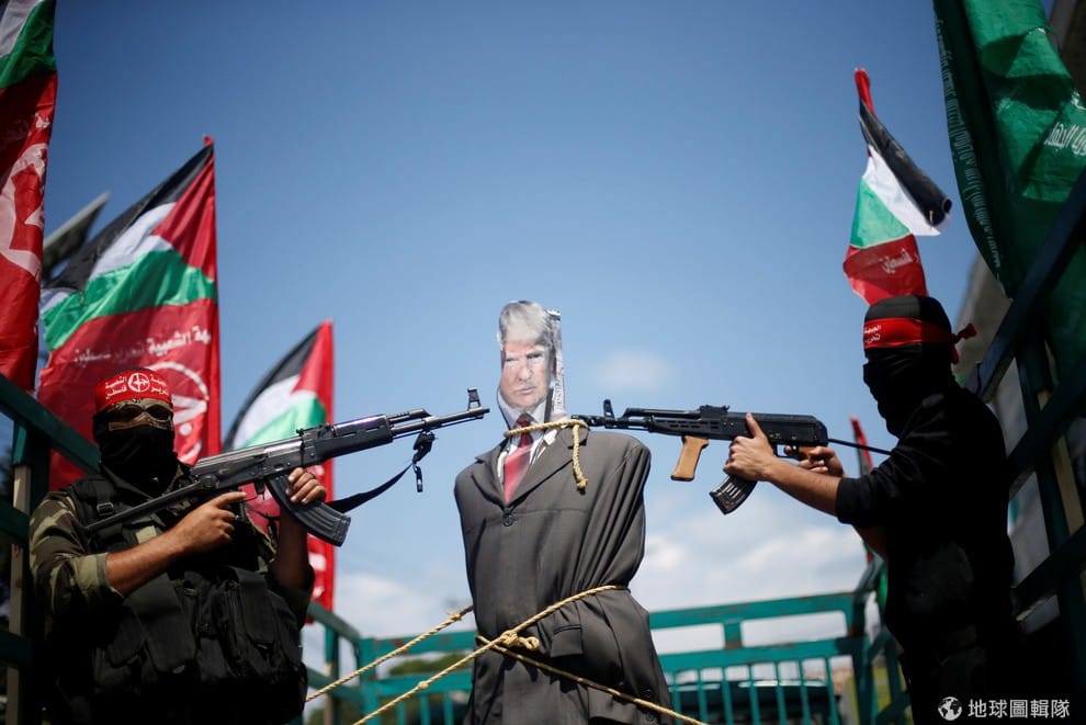 解放巴勒斯坦人民陣線組織(PFLP)成員,手拿武器對準美國總統川普(Donald Trump)的肖像,抗議他和以色列交好。PFLP曾策劃多起針對以色列和西方國家的暴力攻擊,目前被美國國務院認定為恐怖組織。