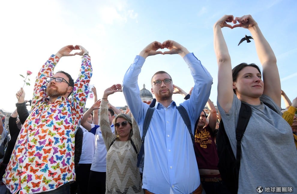 在倫敦特拉法加廣場(Trafalgar Square)前,大批民眾高舉雙手比出愛心,象徵不會被曼徹斯特體育館爆炸案打敗,他們也在同場活動中悼念受害者。