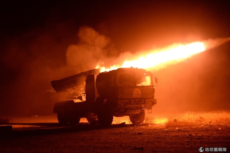 在伊拉克政府軍和恐怖組織伊斯蘭國(IS)對戰的摩蘇爾城(Mosul)西部,當局正朝伊斯蘭國軍人開火,飛彈的火光劃過黑夜。