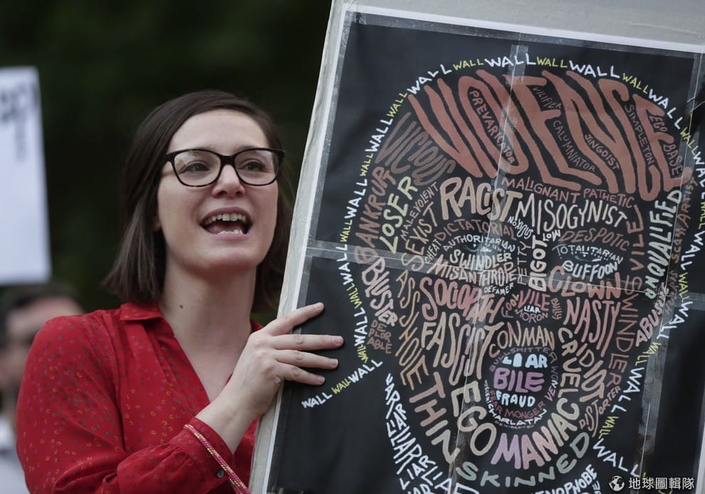 一名女子手舉印有批判美國總統川普(Donald Trump)的海報,在羅馬街頭和其他示威者一起反對川普造訪義大利。