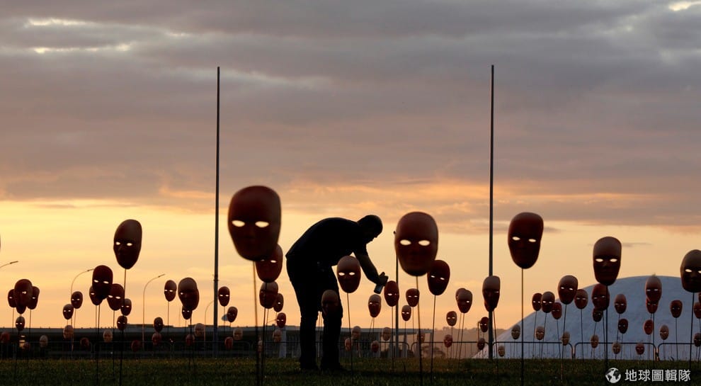 在巴西國會前,一名男子正在彩繪一張張面具,這是非政府組織和平里約(Rio de Paz)抗議當局貪汙所舉辦的活動。