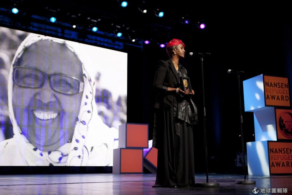 照片中的是哈瓦‧艾登‧穆罕默德女士的妹妹,她代替因病無法前往領獎的姊姊接受聯合國難民署的表揚。哈瓦女士本人的照片投影在後方銀幕上。J Tanner/UNHCR via Getty Images