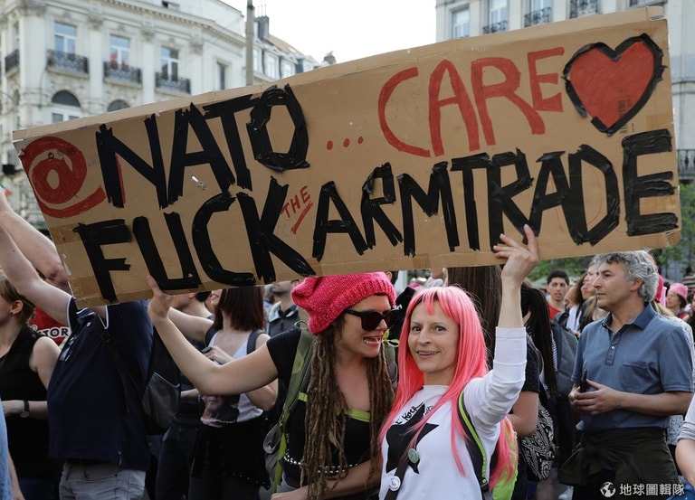 北大西洋公約組織(NATO)高峰會即將在首都布魯塞爾(Brussels)登場,抗議民眾手持反對軍武貿易的牌子上街示威。