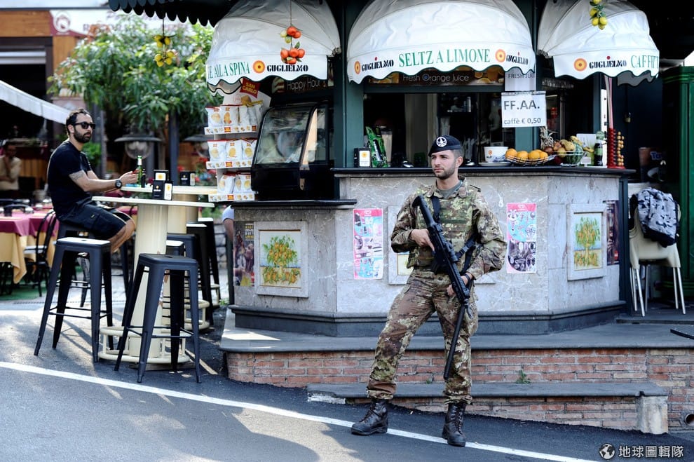 全副武裝的軍人在西西里島的塔奧敏納(Taormina)巡邏,為即將在 26號和 27號登場的G7高峰會嚴加戒備。