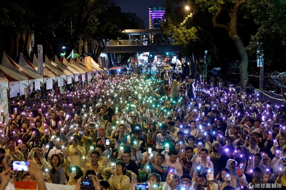 支持婚姻平權的民眾手持發出彩虹光芒的手機,慶祝大法官會議宣布民法中禁止同性結婚的規範違憲,此解釋被視為台灣推動婚姻平權重要的一步,也讓台灣很可能成為亞洲第一個推動同性婚姻的國家。