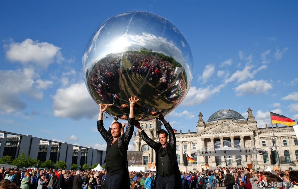 在柏林國會大廈前,身穿黑衣的表演者抬著銀球,為即將開幕的德國福音教派大會營造歡樂氣氛。