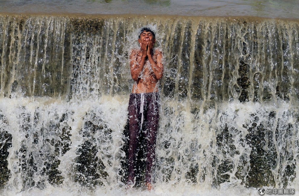 一名男孩在瀑布下方沖涼,好趕走炎熱的暑氣。