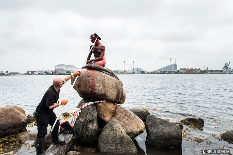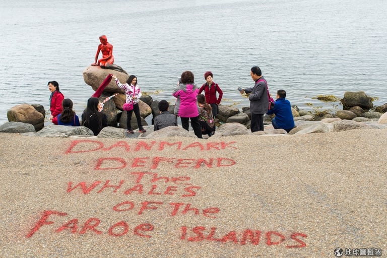 昨日(30),丹麥的小美人魚雕像被不明人士潑上紅漆,地面上則以紅字寫著:「丹麥,捍衛法羅群島的鯨魚們。」
