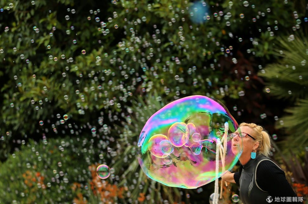 泡泡藝術家在加州聖地牙哥的海洋世界吹起一顆顆大型泡泡,慶祝剛翻新的海洋探索區。