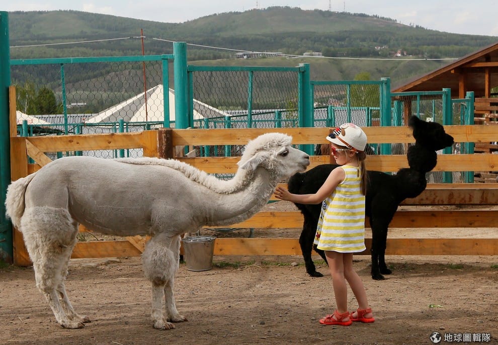 在斯諾亞爾斯克(Krasnoyarsk)的羅伊孚露奇動物園(Royev Ruchey zoo)內,一名小女孩正在和園內的動物明星羊駝玩。