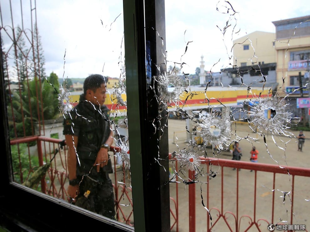 一名警察站在彈痕累累的窗戶後方,地面上是正在和反政府武裝組織「馬巫德」(Maute)作戰的政府軍。