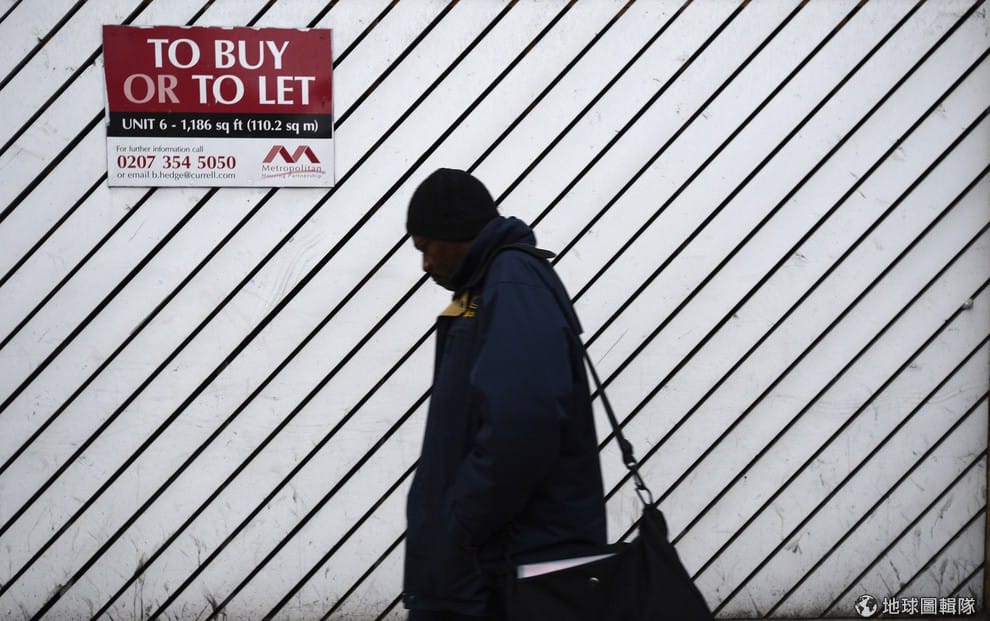 在英國街頭,一名男子走過房屋租售的牌子。對家裡空間不夠大的人來說,以租代買其實是更方便的選擇。