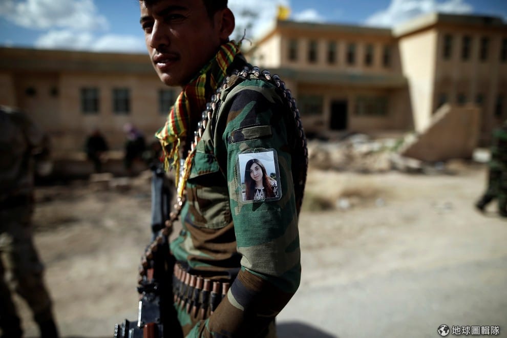 今年 21歲的亞茲迪民眾動員武力(Yazidi Popular Mobilisation Forces)部隊成員艾索(Hussein Eisso)在左臂掛了一張照片,這張照片中的女子是亞茲迪人權運動家,曾被恐怖組織伊斯蘭國(IS)當作性奴的亞茲迪少女塔哈(Nadia Murad Basee Taha),她在去年 12月獲得了捍衛人權和思想自由的沙卡洛夫獎(Sakharov Prize)。逃離伊斯蘭國迫害的她,現在也以人權鬥士的身份分享過去遭到虐待的種種經歷。
