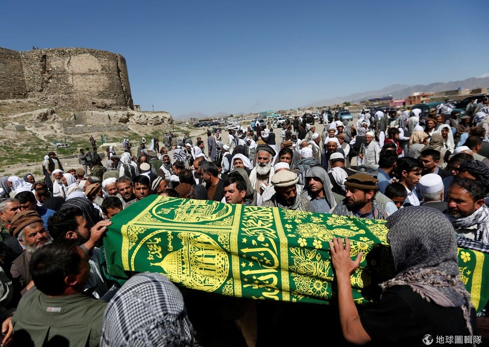 在首都喀布爾(Kabul)近郊,民眾抬著在使館爆炸案中罹難者的棺木準備下葬。
