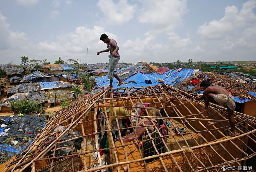 在莫拉(Mora)氣旋襲擊孟加拉東南部的洛興雅難民營後,洛興雅人在竹竿搭建的房舍爬上爬下,忙著重建他們能遮風避雨的地方。