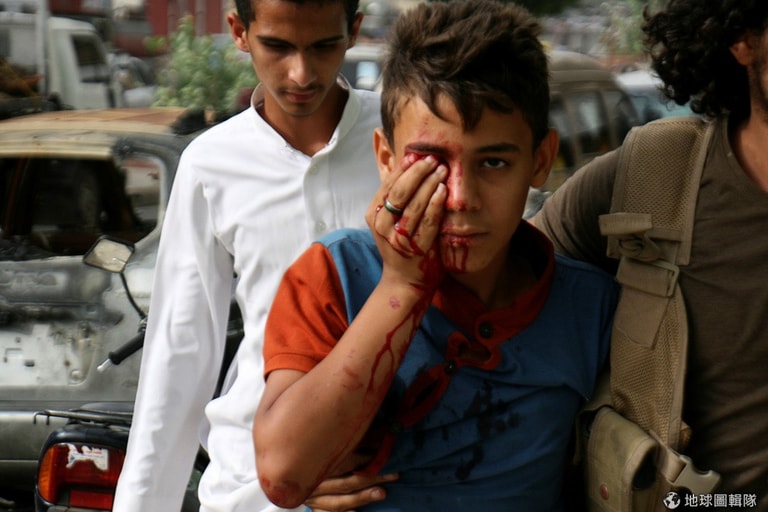 在西南端的塔伊茲市(Taiz),一名男孩被政府軍和反政府胡西(Houthi)組織交火的流彈擊中,臉部頓時血流如柱,在親友的攙扶下送醫治療。