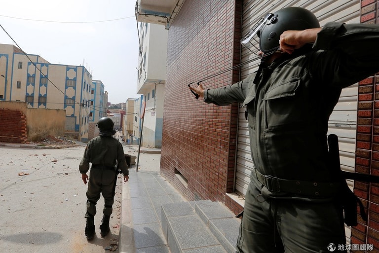 在摩洛哥北部的伊馬祖然鎮(Imzouren),一名鎮暴警察手持彈弓瞄準正在抗議當地官員貪汙的民眾,現場衝突一觸即發。