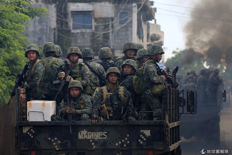 在菲律賓南部民答那峨島(Mindanao)的馬拉韋市(Marawi City),載著政府軍的卡車上街巡邏,掃蕩反政府武裝組織「馬巫德」(Maute)。
