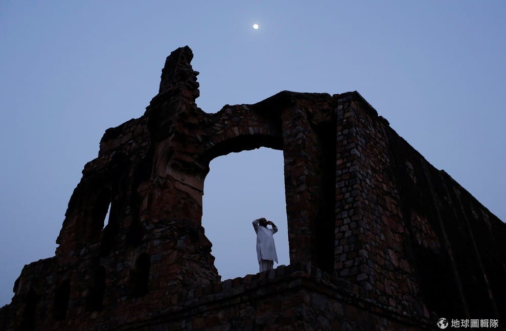 一名穆斯林男子站上已成廢墟的清真寺頂端,大聲提醒其他穆斯林吃開齋飯(Iftar)的時間到了。