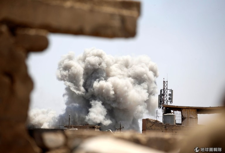 奪回伊拉克土地的摩蘇爾城戰爭持續進行著,圖中伊斯蘭國(IS)的據點在被伊拉克軍的直昇機攻擊後冒起濃濃白煙。