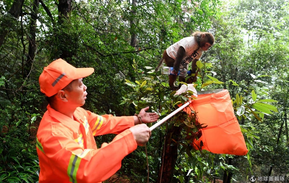 在中國石燕湖生態公園,一隻猴子正在幫忙工作人員收集遊客隨意丟棄的垃圾。