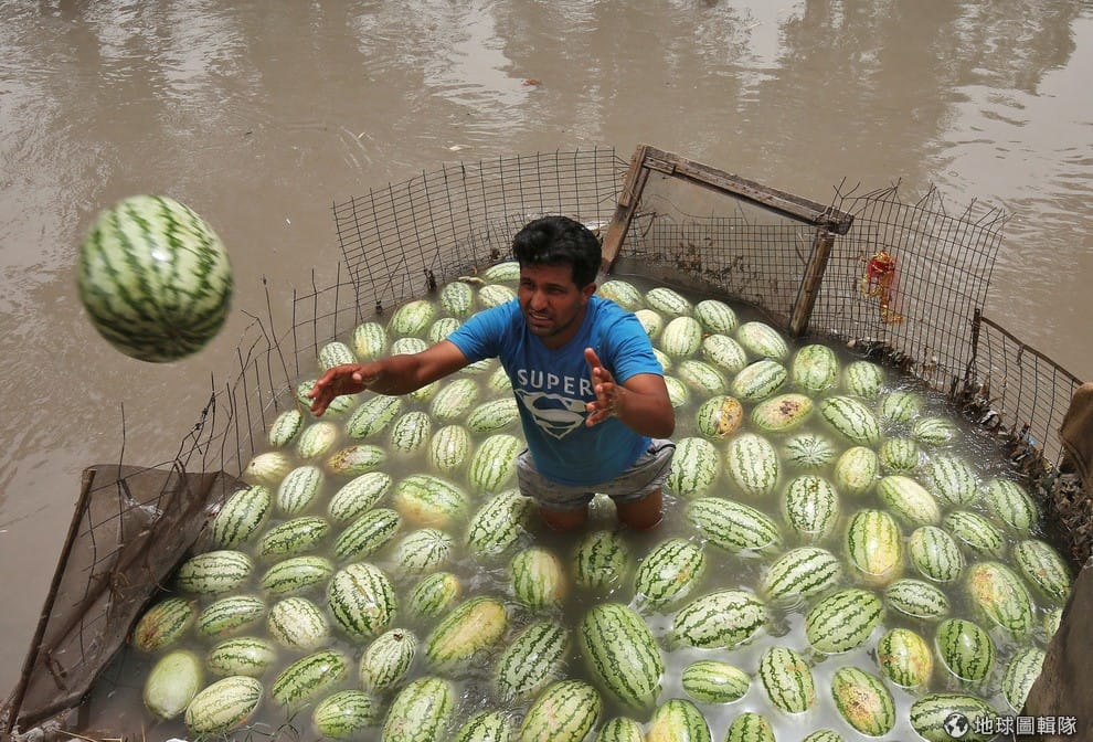 在印度查謨-克什米爾邦(Jammu),水果攤販站在水中把西瓜丟給岸上的顧客。這些西瓜被放在河中降溫,避免炎炎夏日讓西瓜太快壞掉。