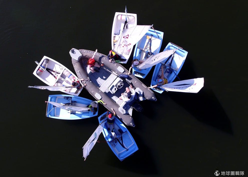 在克拉斯諾亞爾斯克(Krasnoyarsk)的葉尼塞河(Yenisei),數艘單手小艇搭在畫面中間的教練船,準備進行航行訓練。
