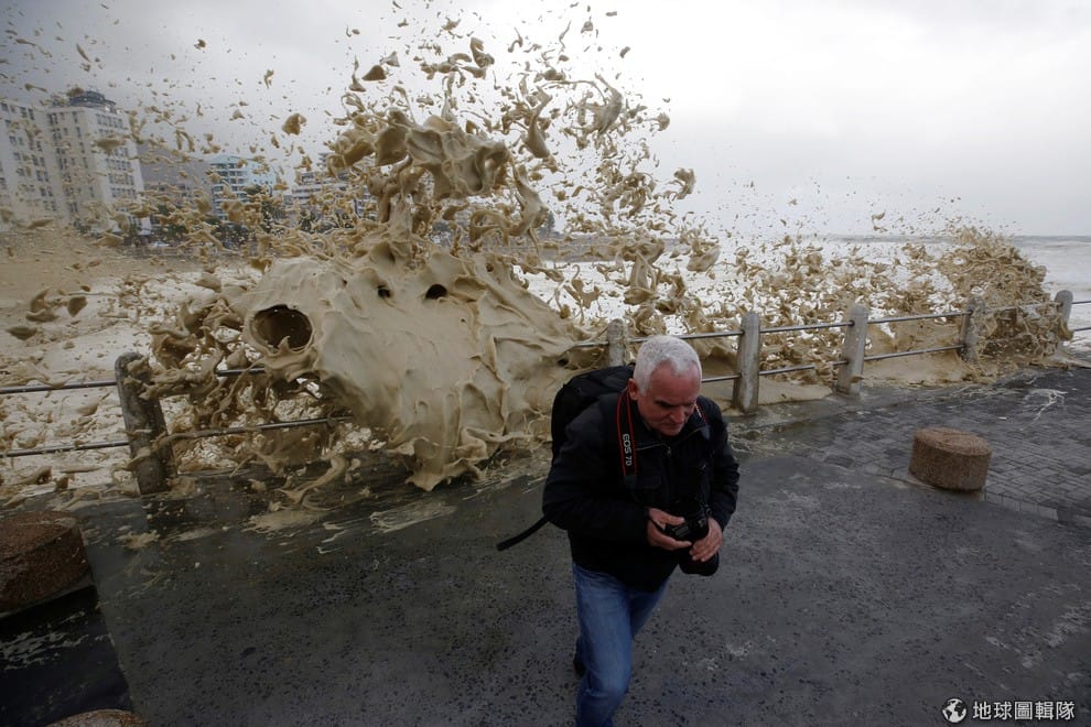 風暴吹起的大浪高高打進了柵欄內,讓攝影師趕忙走避。南非在本月 6號到 7號間受到強烈風暴襲擊,儘管當局警告人們盡量待在家中,不要任意走上街頭,這起風暴還是造成了 8人死亡。