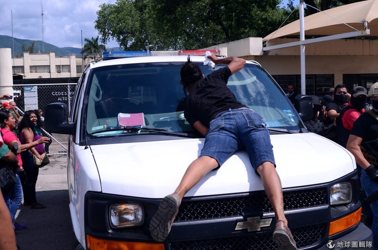 在墨西哥維多利亞城(Ciudad Victoria)的監獄外,一名示威者趴在鎮暴警車前方,希望可以擋下要被轉介到其他監獄的囚犯。