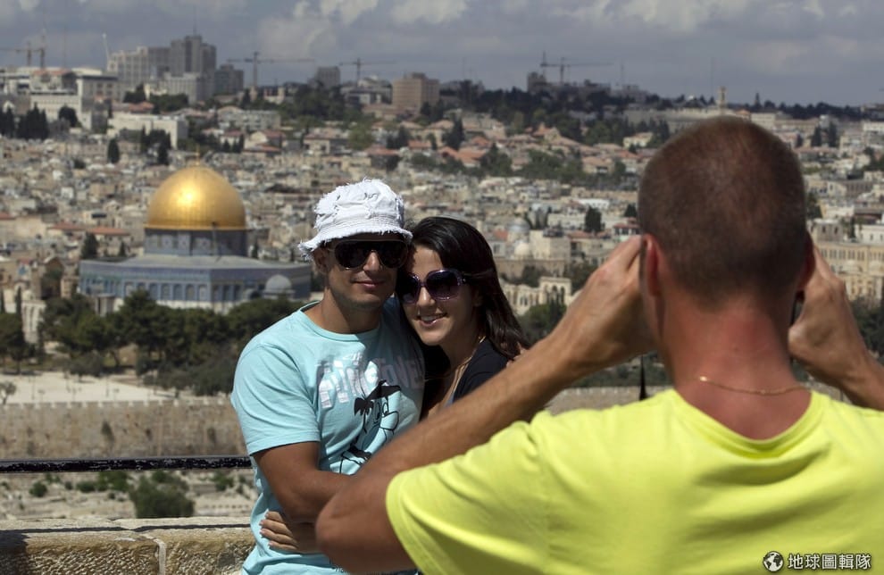 觀光客和身後的耶路撒冷聖殿山(Temple Mount)合影,這裡是以色列人宣稱的「首都」,這裡更是猶太教、基督教和伊斯蘭教這三大天啟宗教的聖地。