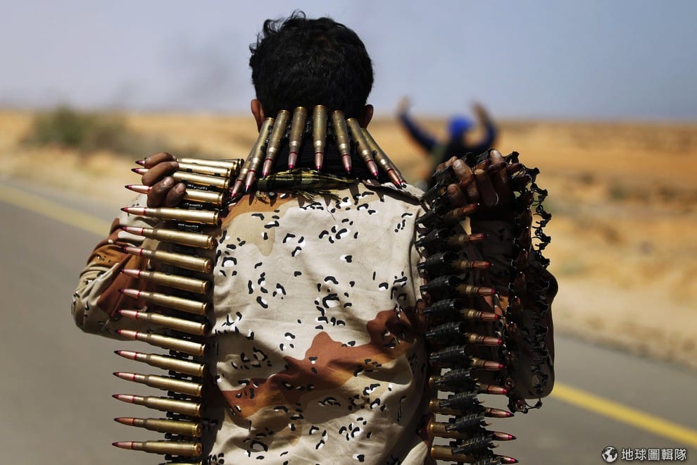 在 2011年3月,一名反政府軍手持大量子彈準備備戰。