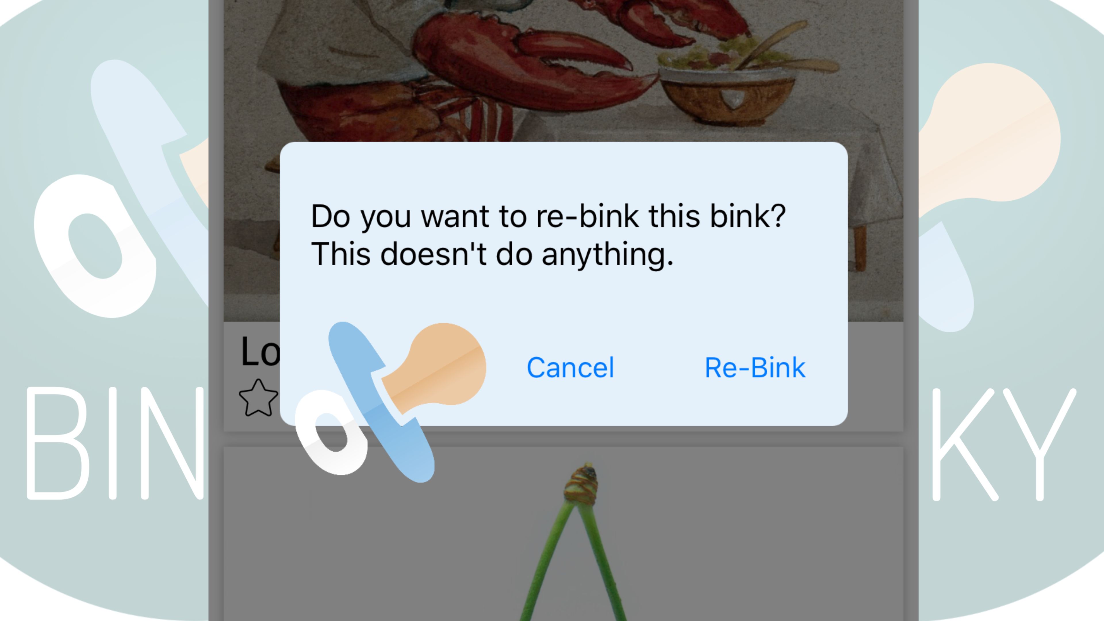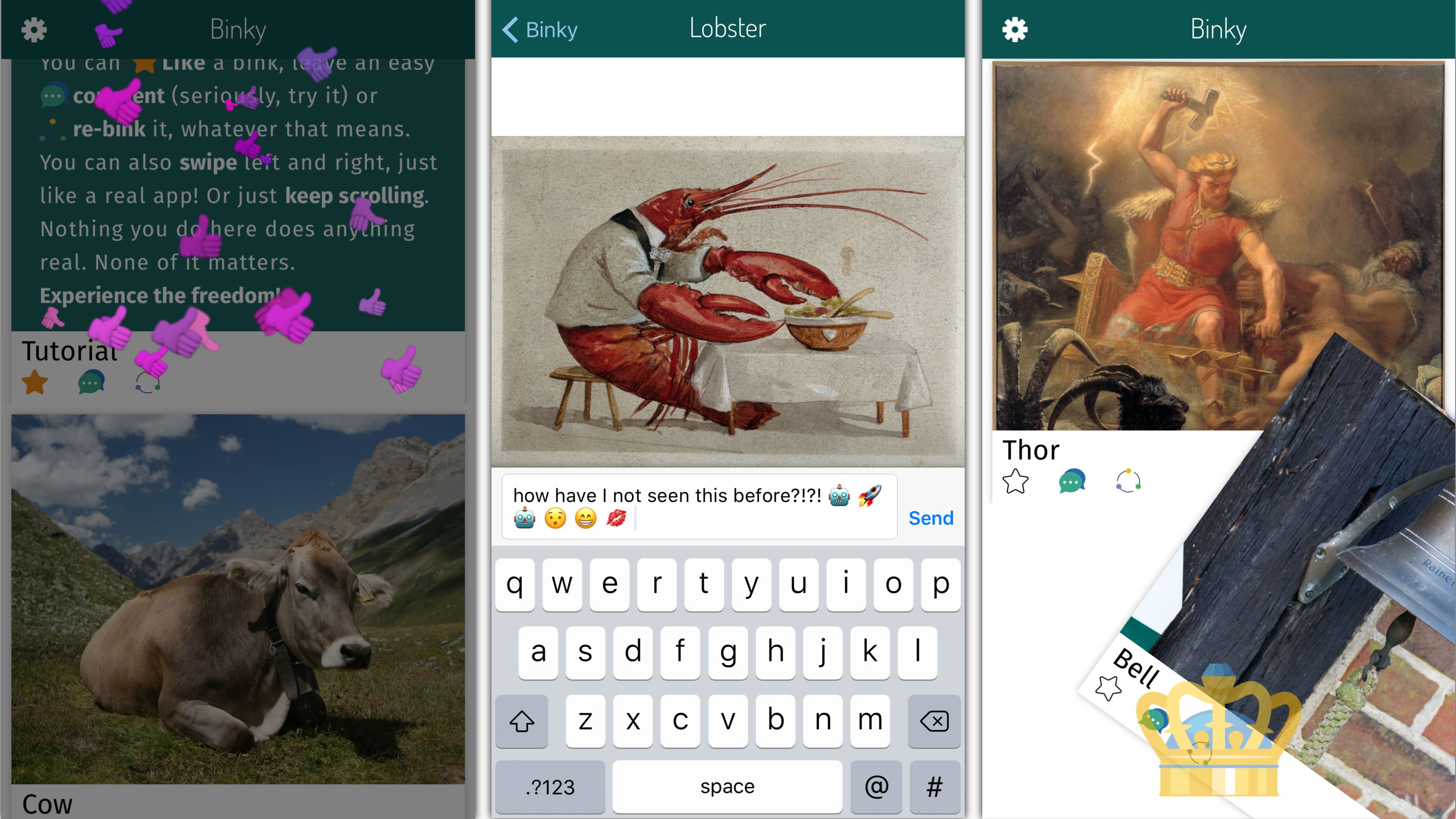 跟嬰兒奶嘴品牌同名的app「Binky」是個畫面跟instagram相似的社群媒體,你可以在喜歡的動態上按「Bink」(並獲得爆炸般的星星畫面),如果覺得按一次不夠,你也可以按完全沒有意義的「再Bink一次」按鈕(然後獲得爆炸般的給讚畫面),而且想按多少次都行。