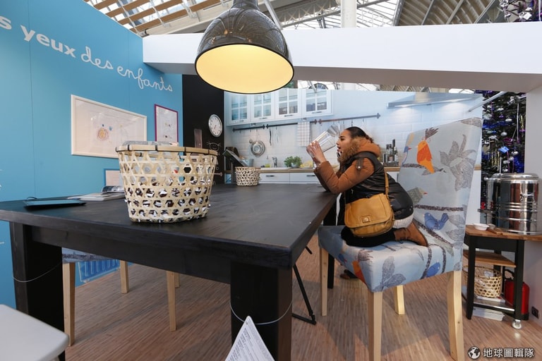 一名女子跪坐在明顯不符合尺寸的超大椅子上。這是IKEA在 2013年的活動,目的是要呈現小孩眼中的傢俱,以及在家中可能面臨的危險。