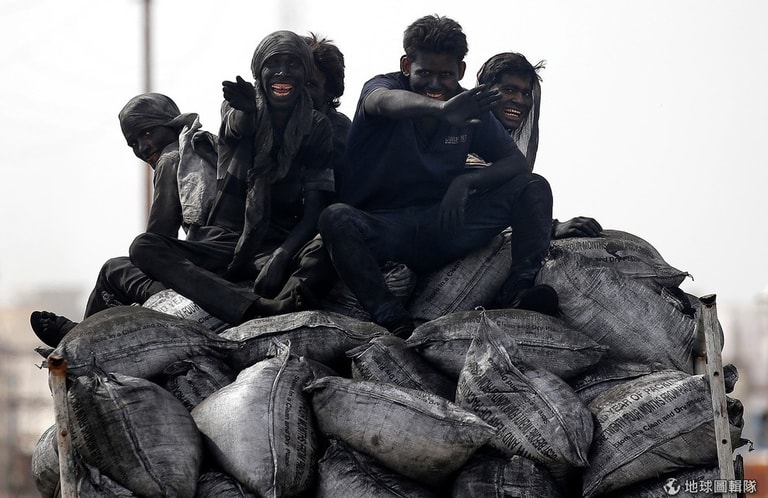 在印度城鎮巴爾薩納(Barsana),剛從礦場離開的礦工們開心向鏡頭打招呼。