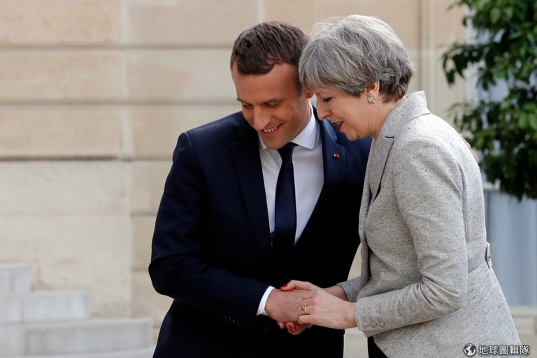 法國總統馬克宏(Emmanuel Macron)在法國總統官邸愛麗舍宮(Elysee Palace)與來訪的英國首相梅伊(Theresa May)打招呼,兩人稍後會一起吃晚餐。