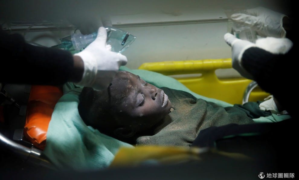 肯亞首都奈洛比(Nairobi)發生了大樓倒塌事件,圖中一名剛從大樓中被救出的小孩正在救護車上接受緊急照護。
