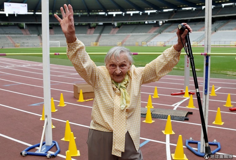 比利時的博杜安國王體育場(King Baudouin)在 13號舉辦了「銀髮族奧林匹克賽」,一名參賽者在完成障礙賽跑後開心比出「勝利」手勢。