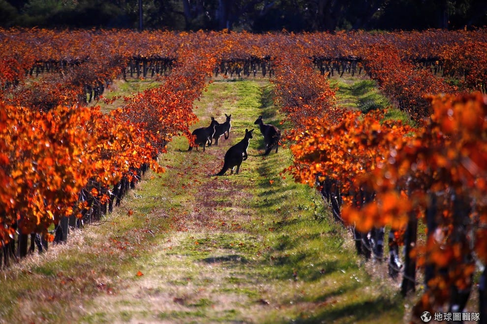 在澳洲巴羅莎山谷(Barossa Valley)的葡萄園,數隻袋鼠悠遊地在葡萄園之間穿梭。