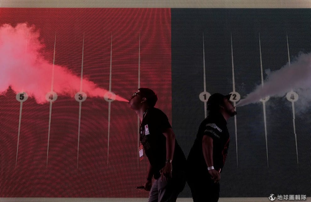 電子煙貿易年會(Vape Trade Convention, VTC)正在進行「煙霧賽跑」比賽,兩名參賽者卯足全力吞雲吐霧,努力製造出最長的煙霧。