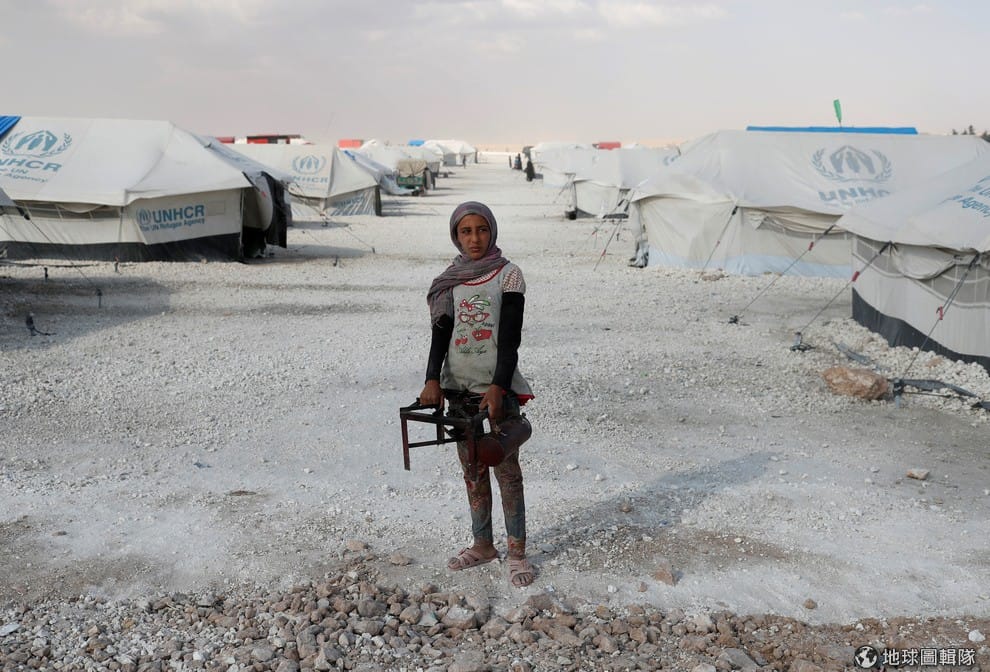 在敘利亞的難民營,一名少女拿著廚具穿梭在帳棚間,她是從伊斯蘭國(IS)控制的拉卡城(Raqqa)逃出來的。