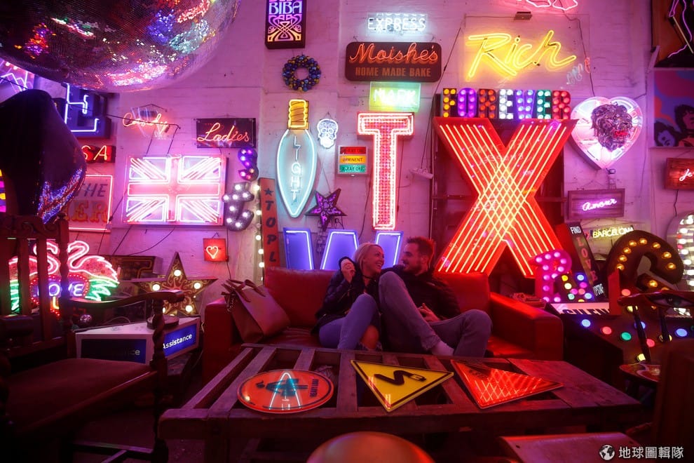 在倫敦一間名為「上帝的垃圾場」的畫廊兼咖啡廳,一對夫婦被各種霓虹燈製成的藝術作品包圍,坐在沙發上談笑風生。