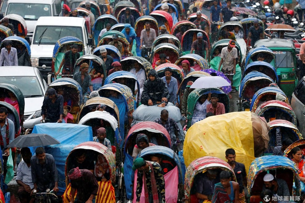 在首都達卡(Dhaka)市區,民眾被車陣困住動彈不得,再加上從天而降的大雨,讓塞車的狀況更加嚴重。