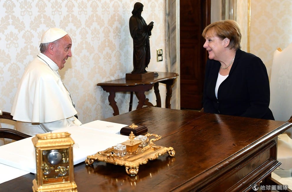 羅馬天主教宗方濟各(Pope Francis)開心地歡迎德國總理梅克爾(Angela Merkel)的來訪,兩人也針對國際情勢交換意見。