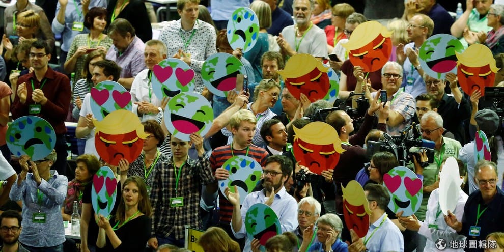 17號這天,關心全球環境的綠黨(Die Gruenen)黨員齊聚一堂,他們高舉地球和美國總統川普(Donald Trump)圖案的紙板,除了表達愛護環境的訴求,也要讓外界知道氣候變遷造成的災難有多急迫。