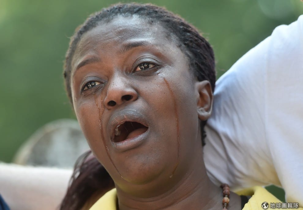在格蘭菲塔(Grenfell Tower)大火過後,一名女子看著被燒地一片焦黑的大樓流淚。